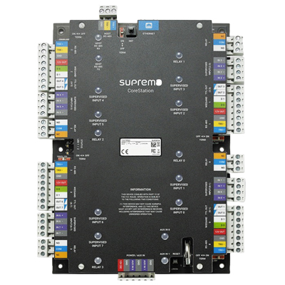 Suprema CoreStation is an intelligent door controller which provides the advantages of a biometric-enabled security over a centralized access control systems. Designed for mid to enterprise-level systems, the CoreStation handles up to 500,000 users with an incredible fingerprint matching speed of up to 400,000 match/sec. With the provisions of high-performance, biometric readiness, Ethernet communication, CoreStation is capable of offering the full features of the BioStar 2 platform. The device provides centralized biometric template management and also interfaces with complete set of reader technologies including RS-485 (OSDP) and Wiegand. With its versatility, CoreStation is a perfect access control solution for both new installations as well as a replacement of existing systems. 1.4GHz Octa Core, 4 door controller (extendable up to 132 doors), RS485 5 channel, Wiegand 4channel, 8 Supervised Input, 8 TTL Output, 4 Relay.