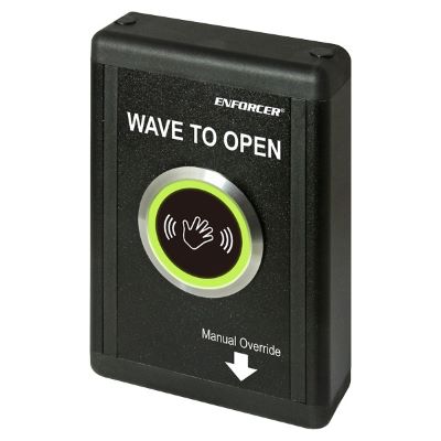 The ENFORCER Surface-Mount Wave-to-Open Sensor with Manual Override Button is a full-featured exit plate which uses IR technology to allow egress from a protected area or activate a device with the simple wave of a hand. Since no touch is required, this sensor is suitable for use in hospitals, clinics, labs, cleanrooms (to reduce the risk of contamination), schools, factories, or offices. A manual override allows for operation if the sensor is disabled.