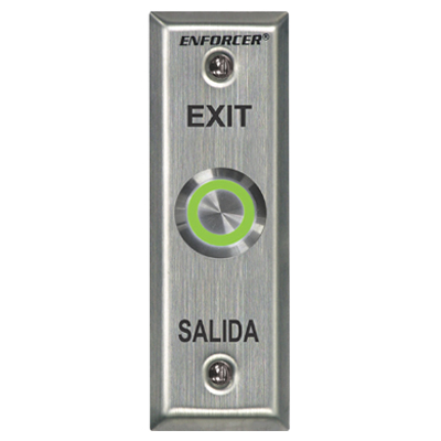 Vandal-resistant, 1" diameter, illuminated, momentary pushbutton on slimline plate. Field-selectable LED color: red, green, blue, magenta, yellow, cyan, or white (12VDC). "EXIT" and "SALIDA" printed on plate.