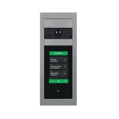 Ultra series surface-mounted audio/video entrance panel with 5” Touchscreen module for IP (ViP) system. Twilight sensor for touchscreen backlighting management. Omnidirectional digital microphone and double loudspeaker for high-fidelity audio. Wide-angle colour video camera with 160° horizontal, 100° vertical field of vision. Audio-visual indications for disabled individuals assistance request. 5” high-visibility capacitive display with impact-proof glass and theme selection (black or white). User-friendly graphic interface, can be customised with virtual call buttons or a number keypad to call the user directly when the code is known. Access control function with audio or audio/video module output and system actuator activation. Option of customising the buttons for direct calls to the switchboard, commercial activities with corresponding logos and viewing welcome messages. It has a Wiegand output for interfacing with access control systems, an RFID reader for activating an opening using keys or Comelit cards, and a Bluetooth connection. Consists of audio/video module art. UT8020, Touch module art. UT9270 and surface-mounted housing art. UT9173. Just 35 mm protrusion from the wall.