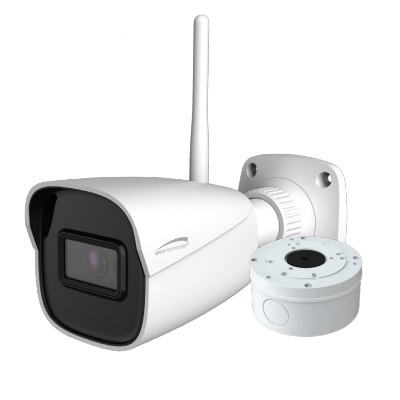 4MP 2.4HHz WiFi IP bullet camera with 2.8mm fixed lens, white housing. NDAA compliant.