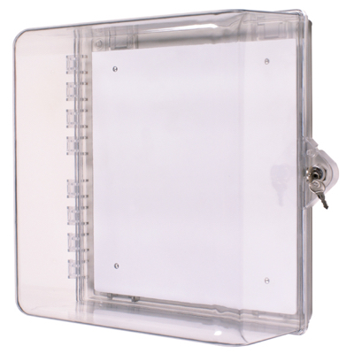 Multipurpose lockable cabinets for remote annunciators, fire alarm control panels or other electronic products which require physical or environmental protection. Helps guard against vandalism (accidental or intentional), as well as dirt, dust and grime (models without alarm). Covers mount on the wall enabling the unit to be stored in a central location. The cabinets are available with a key or thumb lock, with or without siren alarm or siren/strobe alarm. They also have an additional eyelet for a secondary lock or safety seal. Dimensions 12" X 14" X 6.37".