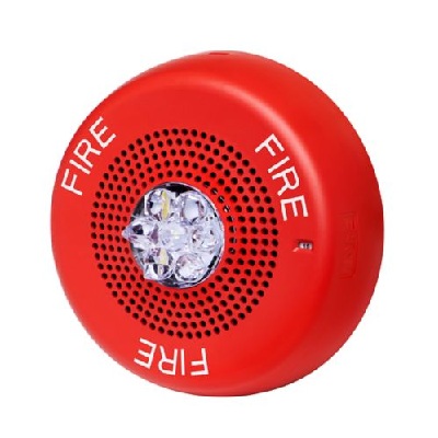 Eluxa high fidelity speaker strobe, red, ceiling, 24 VDC, 15/30/75/110/150/177 candela, "Fire" lettering.