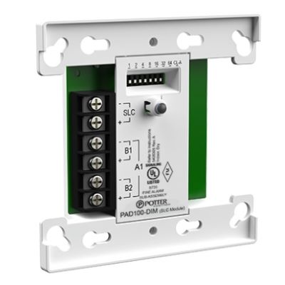 The PAD100-DIM is compatible with Potter’s IPA and AFC/ARC series addressable fire alarm control panels. The PAD100-DIM is an interface module used to monitor dry contact devices such as sprinkler waterflow, valve tamper switches, or conventional pull stations. The module is capable of monitoring two separate Class B or one Class A circuits.
