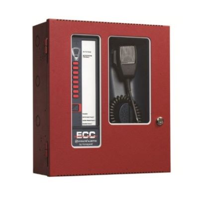 The ECC-RPU is an optional Remote Page Unit that is compatible with the ECC-50/100(E) Emergency Command Center for fire protection applications. It is part of the family of external remote consoles that allows for extending the ECC-50/100(E) display and control to remote locations within a building. It is housed in a cabinet with a keyed or an optional thumb lock to limit access to qualified personnel. The ECC-RPU includes a built-in microphone and 8 selection buttons that can be pushed to activate the system remotely. ALL CALL paging can be broadcast over the speaker circuits by depressing the microphone's push-to talk button. As an added benefit, the 9th button on the RPU can be used to activate an MMF-300 monitor module that may be installed inside the ECC-RPU cabinet to be used for applications such as HVAC shutdown.