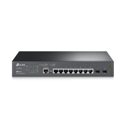 Omada 8-Port Gigabit L2+ Managed switch with 2 SFP slots, 8× Gigabit RJ45 Ports, 2× Gigabit SFP Slots, RJ45/Micro-USB console port, 1U 13-inch Rack-mountable steel case, integration with JetStream™ SDN controller, static routing, OAM, DDM, 802.1Q VLAN, QinQ, STP/RSTP/MSTP, IGMP Snooping, 802.1p/DSCP QoS, ACL, 802.1x, Radius/Tacacs+ Authentication, LACP, CLI, SNMP, dual Image/Configuration, IPv6.