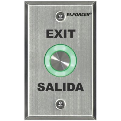 The SD-6276-SS1Q is a piezoelectric push button. Vandal-resistant, single-gang plate. "EXIT" and "SALIDA" printed on plate. Programmable illumination surrounding the button: red or green.