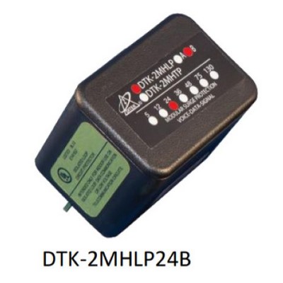 The DTK-2MHLP24B provides surge protection for two 24V alarm system loop circuits in a field-replaceable module. Required snap-track bases, protect up to 10 pairs with a common ground.