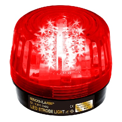 9~24 VAC/VDC LED Strobe Light. Incorporates 32 LEDs. 50,000-Hour operating life. 8 different flash patterns. Adjustable flashing speed. Indoor/outdoor use. Red lens.