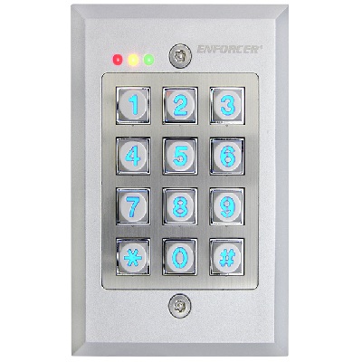 Flush-Mount Outdoor Illuminated Stand-Alone Keypad. Weather resistant and vandal resistant. 1100 Users, two outputs, 12~24 VDC/VAC operation. Includes duress, quick code, wrong-code lockout, smart egress input, visitor codes, three LEDs, built-in buzzer, and back box.